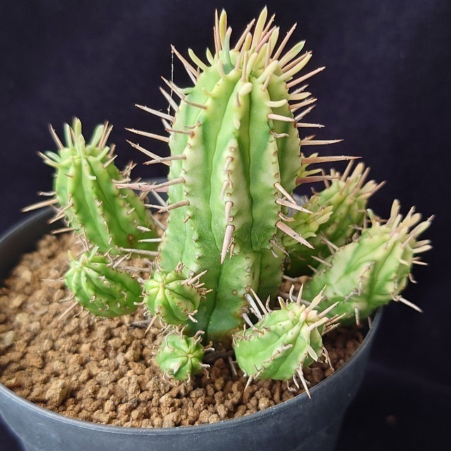 W.6cm 斑入りの綺麗な品種です。 最初、ノリ斑なのかな?と思ってたんですが、ノリ斑というより、生長点が一番明るくて、後で地色が出てくる、後くらみ斑のようです。 斑が明るく出過ぎたところはそのまま緑にならなかったりしていて、そういう加減で斑が不規則な模様になって残ったりしているようです。 挿し木できないこともないですが太い枝でないと難しいです。しかし他のユーフォルビアには接ぎ木で付きやすかったです。