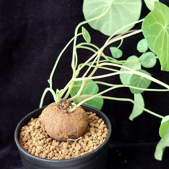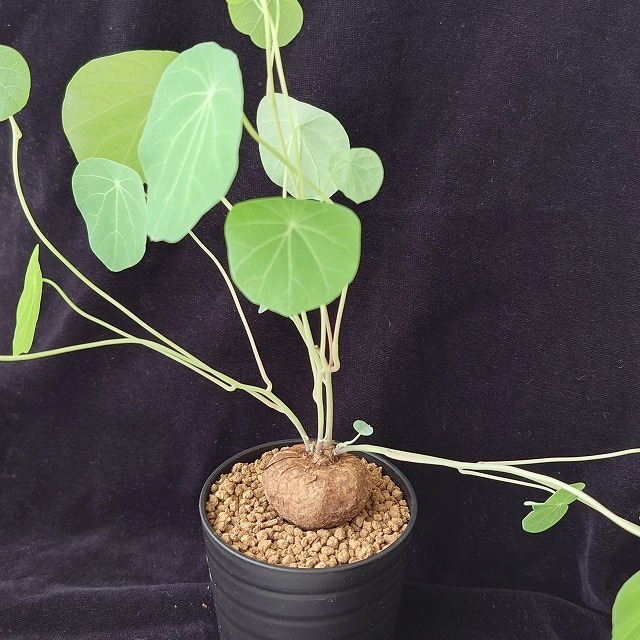 W.3cm(コーデックス部分) 丸い葉っぱが可愛い品種。暖かい時期によく育ち、寒い時期は落葉します。 イモを観賞用に露出させていますが成長のことを考えたら、埋めぎみに管理した方が良いです。 その場合は通気性の良い土を上部に敷くようにして下さい。 寒い時期は7度を保ち、家になかで落葉後断水して冬ごしします。 蔓はイモから何本も出るタイプです。